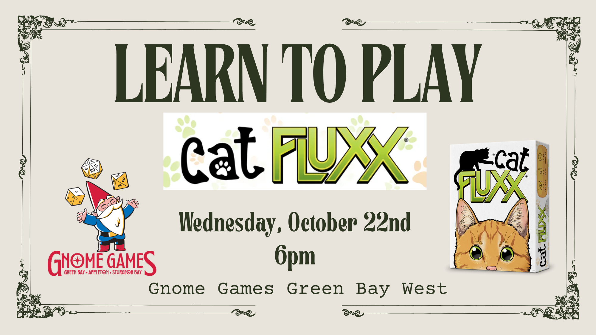 Learn to Play Cat Fluxx with Gnome Games!  Wednesday, October 22nd at 6pm, one of the Gnomes will be helping players learn to play Cat Fluxx, which puts a fun feline spin on the classic simplicity of the Fluxx card game series!