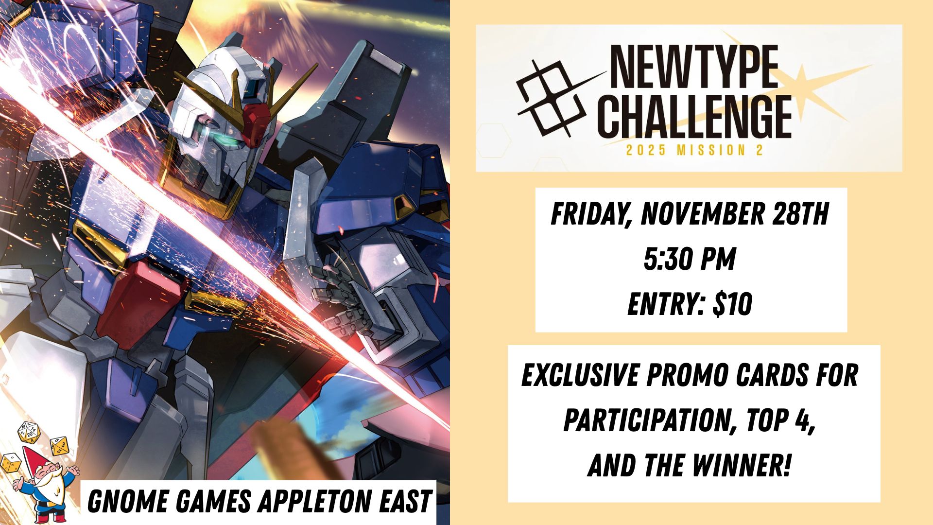 Join us at Gnome Games Appleton East for a Gundam Card Game Newtype Challenge 2025 Mission 2!