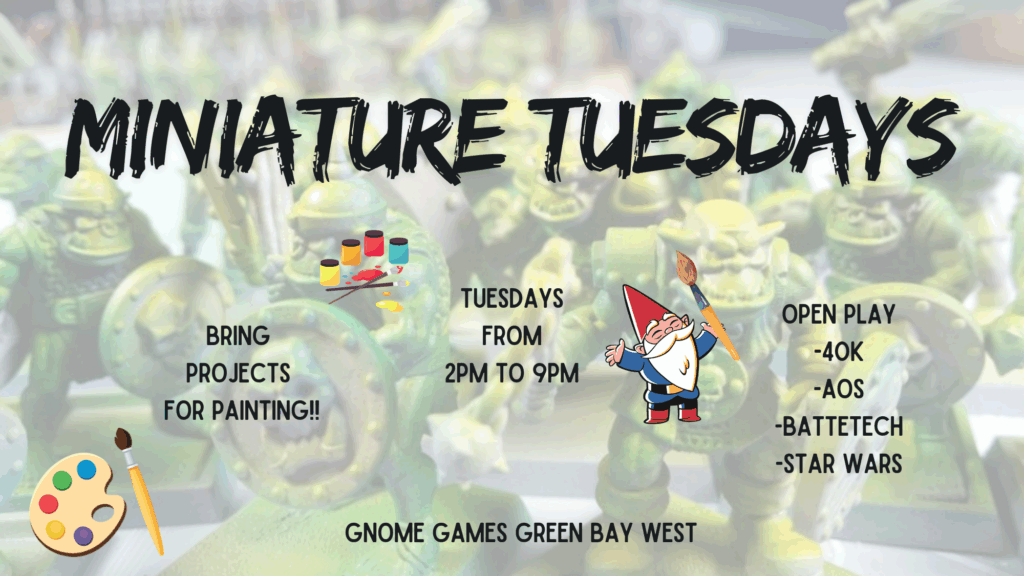 Grab a snack and paint the night away! Limited brushes and paints are available. We have a selection of miniatures, brushes, and paints for purchase if you’d like more to work with! A Free Space Marine miniature is available to first time painters at The Gnoshery while they last! Prepped and ready to paint!
