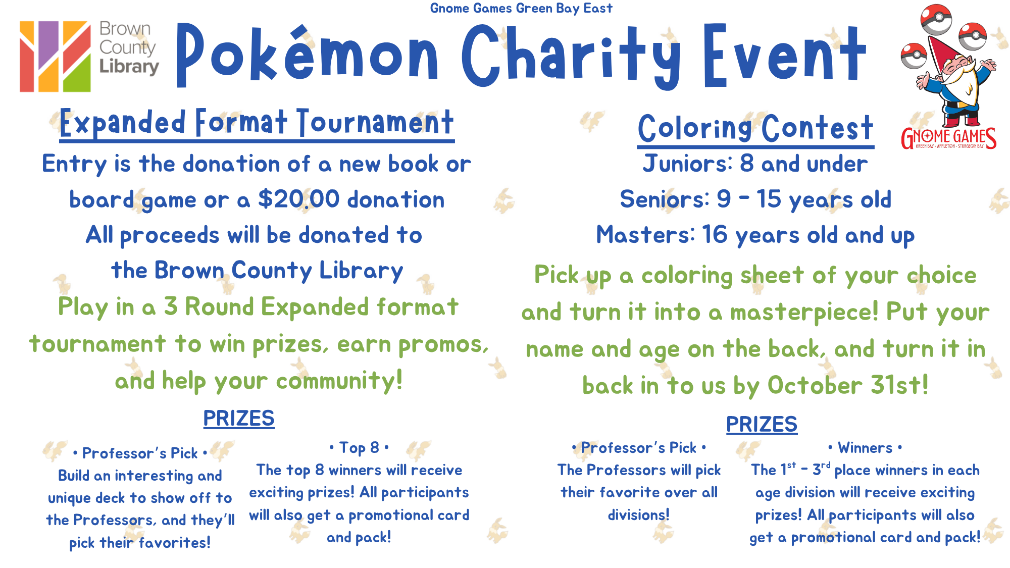 We are hosting a Pokémon Charity Event with proceeds going to Brown County Library! We have an Expanded Tournament and the start of our Coloring Contest!