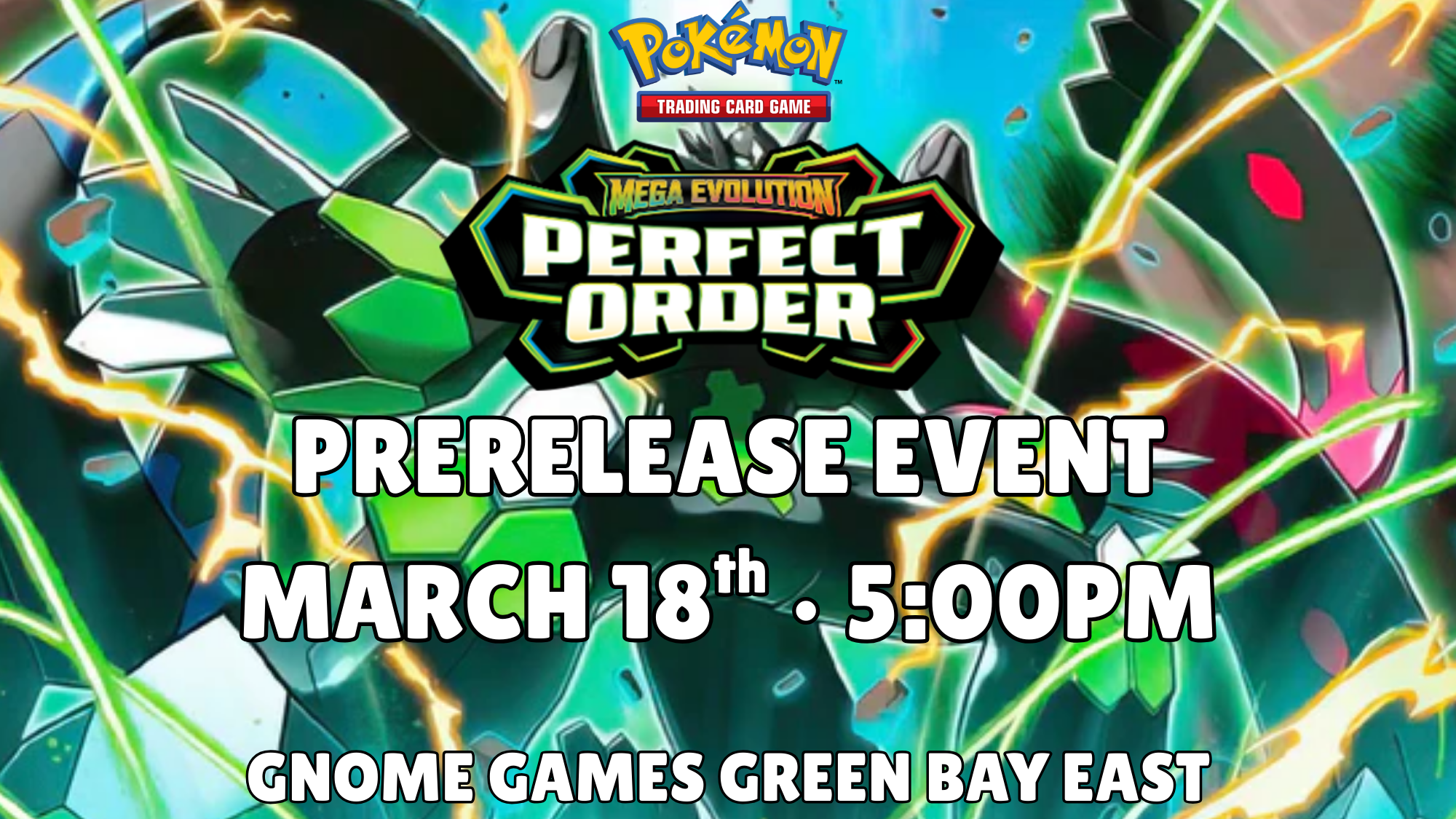 Come play in our Pokémon Mega Evolution—Perfect Order Prerelease at Gnome Games Green Bay East!
