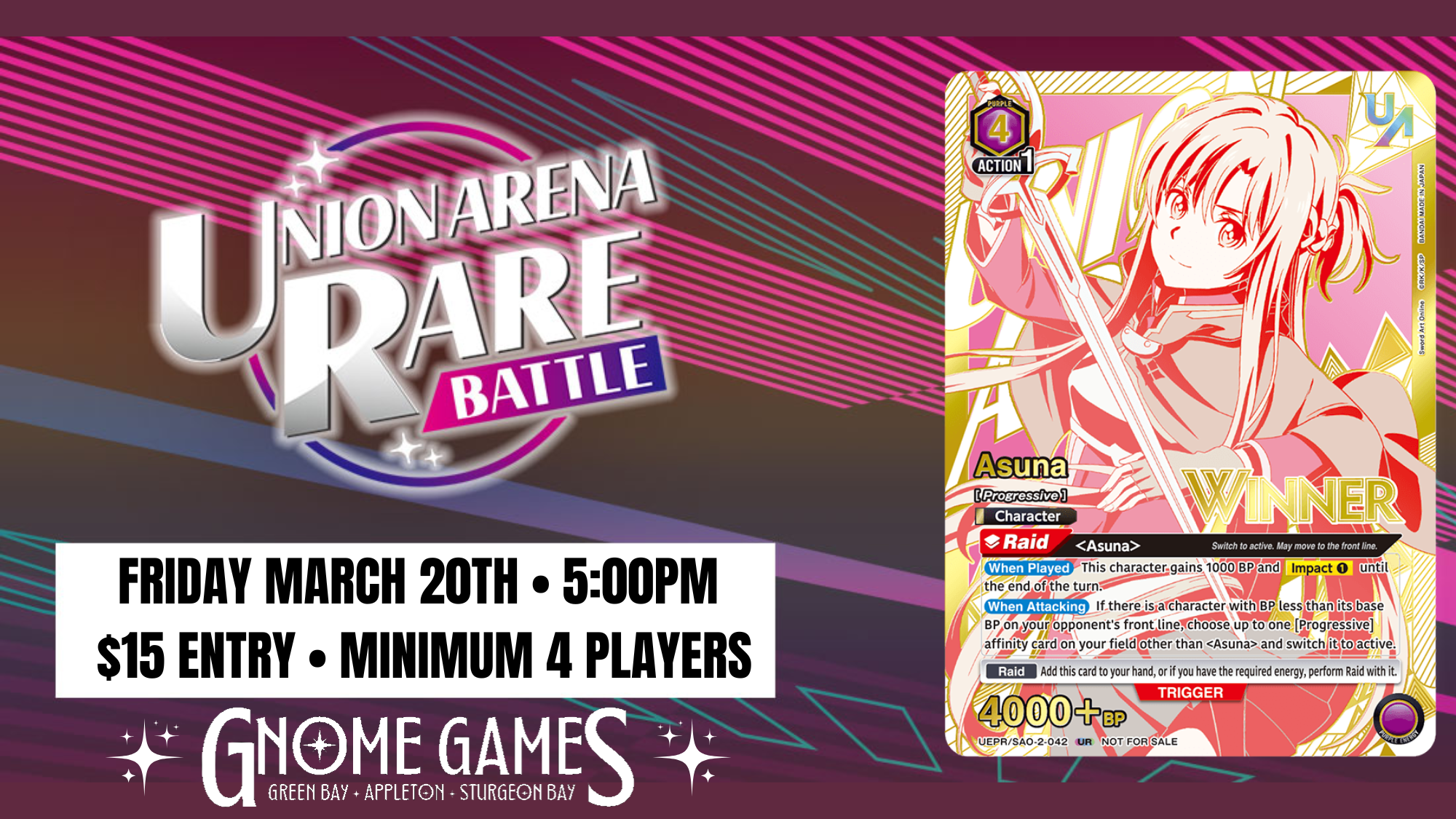 Join us at Gnome Games Green Bay East for our Union Arena Rare Battle: Sword Art Online Vol.2!