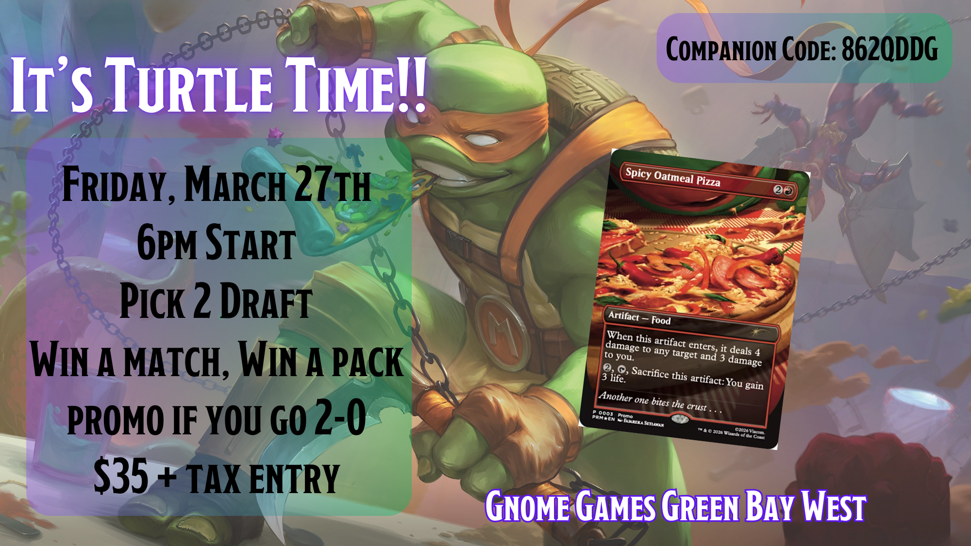 Friday nights at 6pm, $35.00 entry for this special Pick 2 Draft event named, “It’s Turtle Time!”