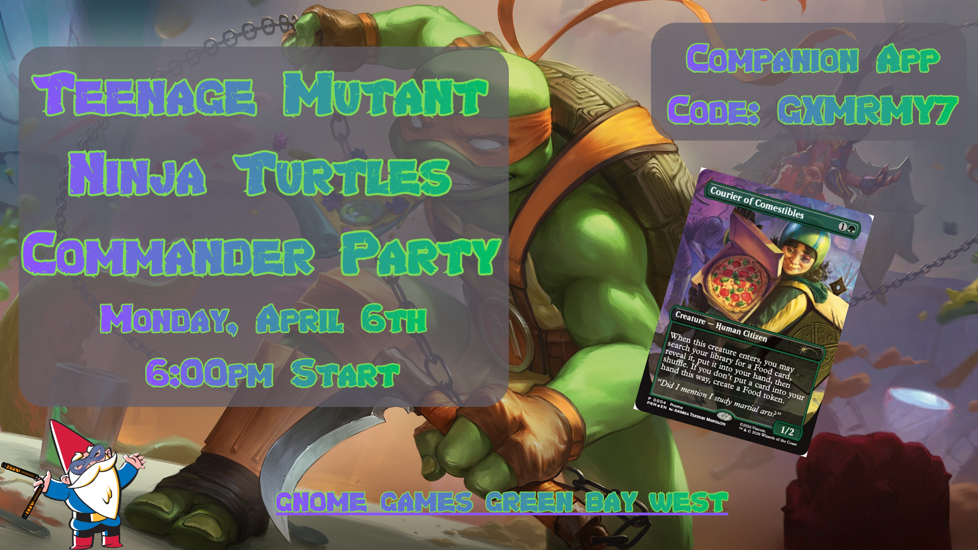 Green bay west courierJoin the Gnomes at Gnome Games Green Bay West for some Teenage Mutant Ninja Turtles fun with a Two-Headed Giant Commander Event celebrating this totally Turtle Power filled set on Monday, March 30th!