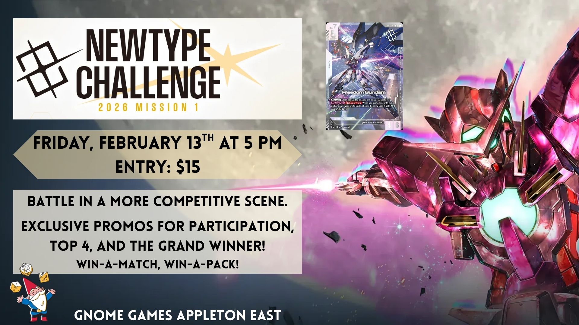 On Friday, February 13th at 5 PM we’re hosting a Newtype Challenge 2026 Mission for the Gundam Card Game! Kick off 2026 with the first Newtype Challenge of the year! Aimed at our more competitive crowd, the Newtype Challenge is a Swiss style with rounds based on attendance. At most, we will have 5 rounds. Each round is 30 minutes, best of one, then launches right into Top Cut! Top Cut rounds will go up to 60 minutes, best of 3. Each participant will receive a GD03-118 Awakened Potential, the Top 4 will receive a ST04-010 Kira Yamato, and the grand Winner will receive a GD01-065 Freedom Gundam!