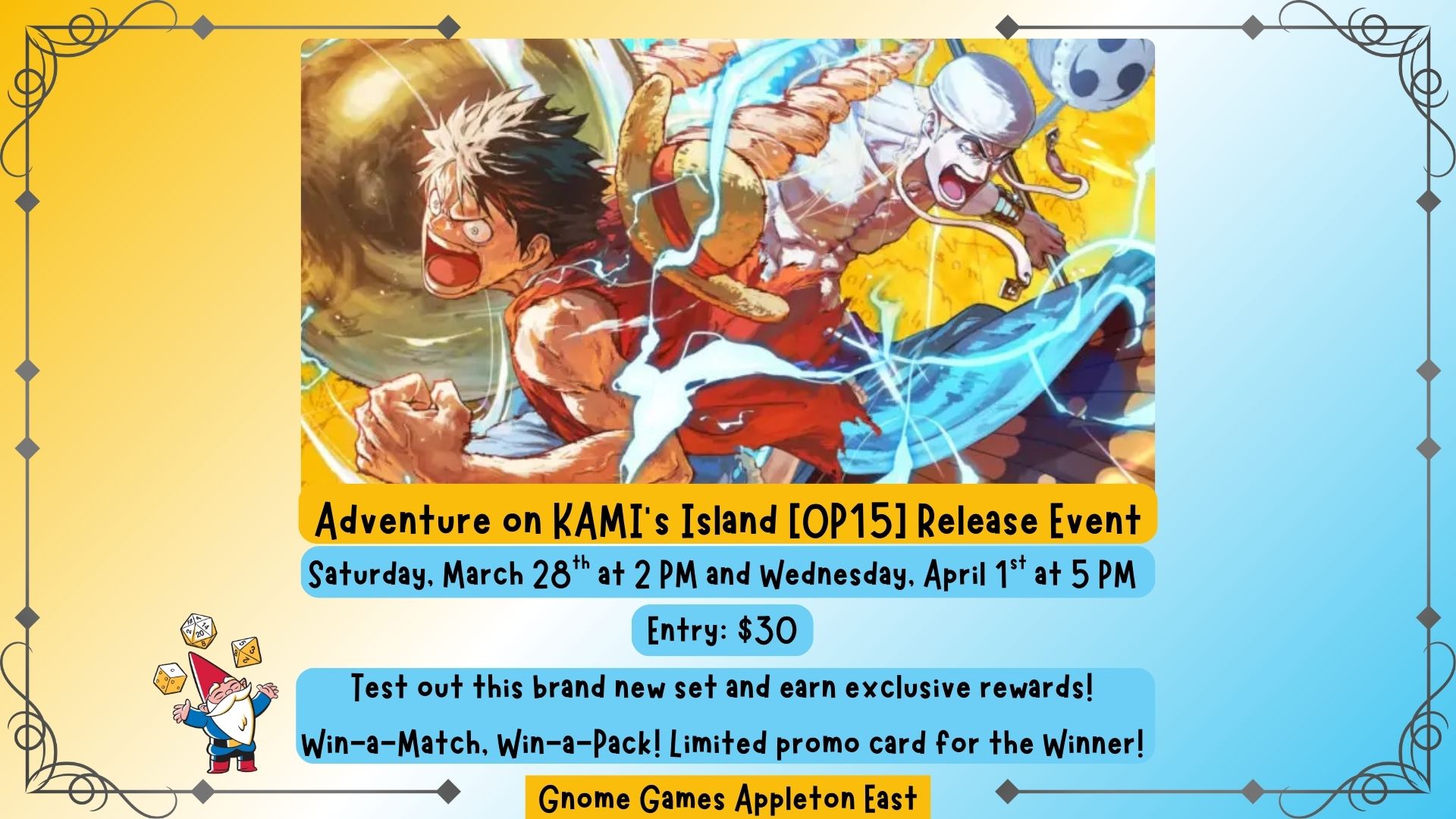 Join us at Gnome Games Appleton East for our One Piece Card Game Adventure on KAMI’S Island [OP15] Release Event!