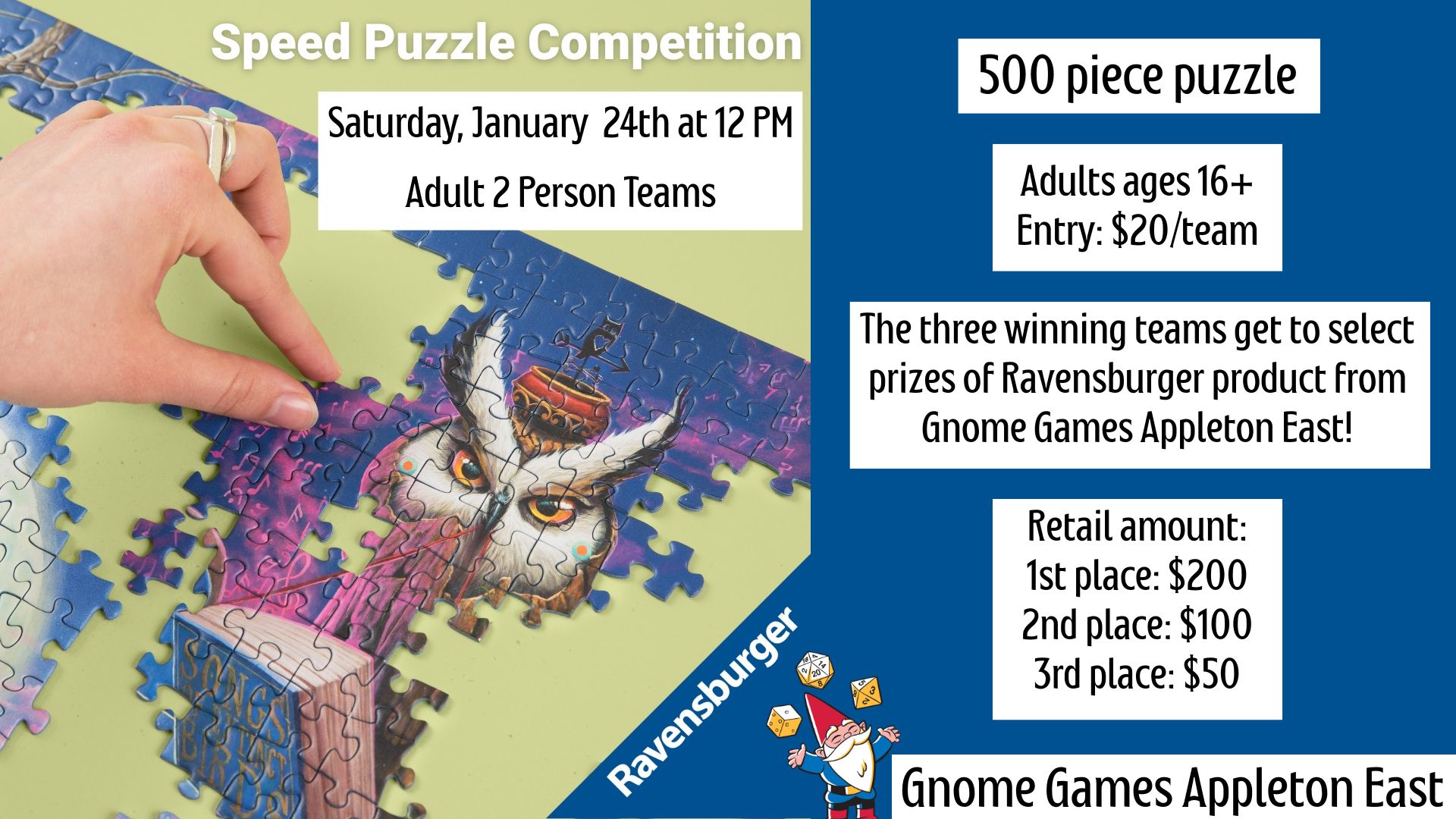 Join us at Gnome Games Appleton East for our Ravensburger Puzzle Competition!