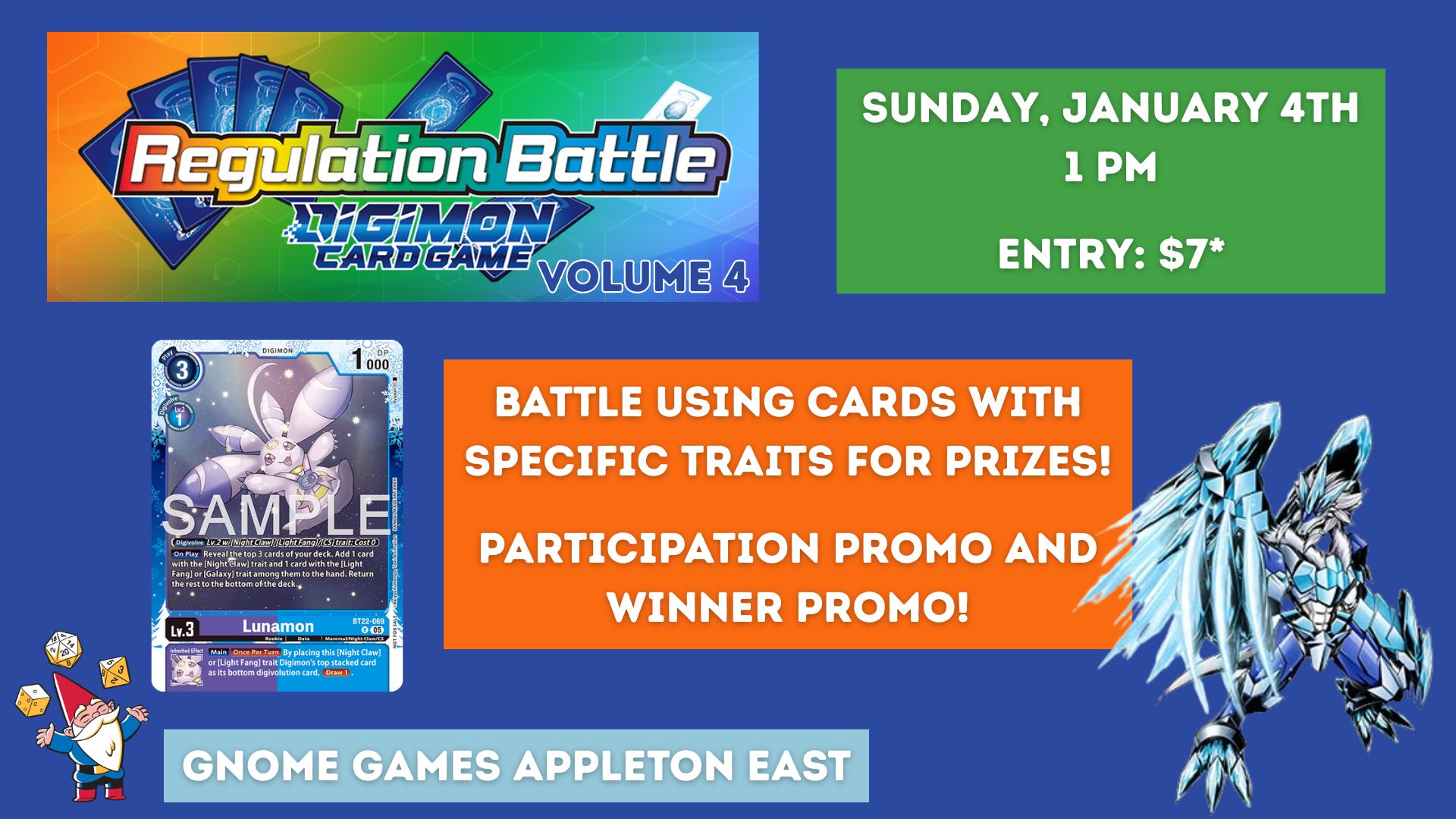 Join us at Gnome Games Appleton East for our Digimon Regulation Battle Volume 4!