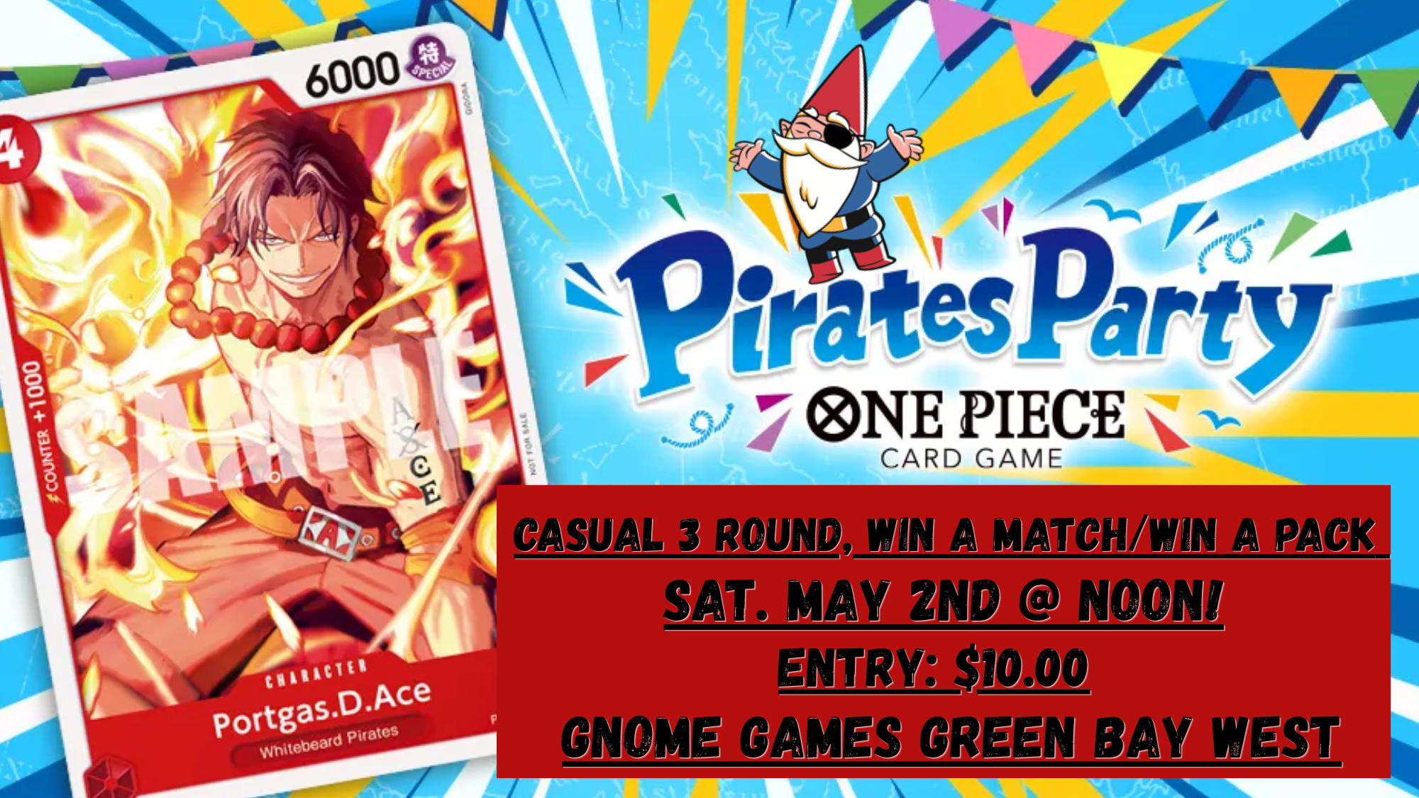 Join us at Gnome Games Green Bay East a brand-new event format for the One Piece Card Game – Pirates Party! Compete in an exclusive tournament in the Limited Deck Battle Format for One Piece Pirates Party! These new tournaments ban the top 10 most used Leader cards for a more casual environment. These function as 3 round Swiss style tournaments. Each round won awards players with a pack of One Piece! Rounds are 30 minutes, best of one. Participants all receive a P-119 Portgas.D.Ace and a Volume 1 2026 Welcome Pack!