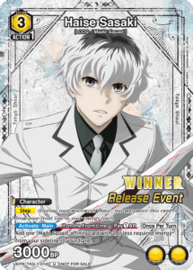 Join in the fun with the release of Tokyo Ghoul in a 3 round Swiss style Tournament! Players will open 5 packs of Tokyo Ghoul and use them as a deck to compete in matches. Each round won awards players with an additional pack! Each participant gets a Release Event Pack and a promotional card. One Winner will get a special Winner foil stamped promotional card!