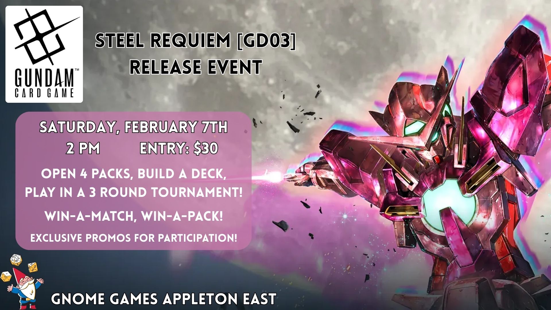 On Saturday, February 7th at 2 PM we’re hosting a release event for Steel Requiem [GD03]! Open up 4 packs, build a deck, and play in a 3 round Swiss style Tournament! Players will have 30 minutes to build their deck, then we’ll launch straight into the tournament! Each round is 30 minutes, best of one, and each round won awards players with an additional Steel Requiem pack! Each participant will receive a set of GD03-020 Zaku II FZ & GD03-089 Bernard Wiseman, and the winner will receive an additional set! The top 8 participants will receive a ST05-010 Mikazuki Augus with artwork newly illustrated by Toyotaro!