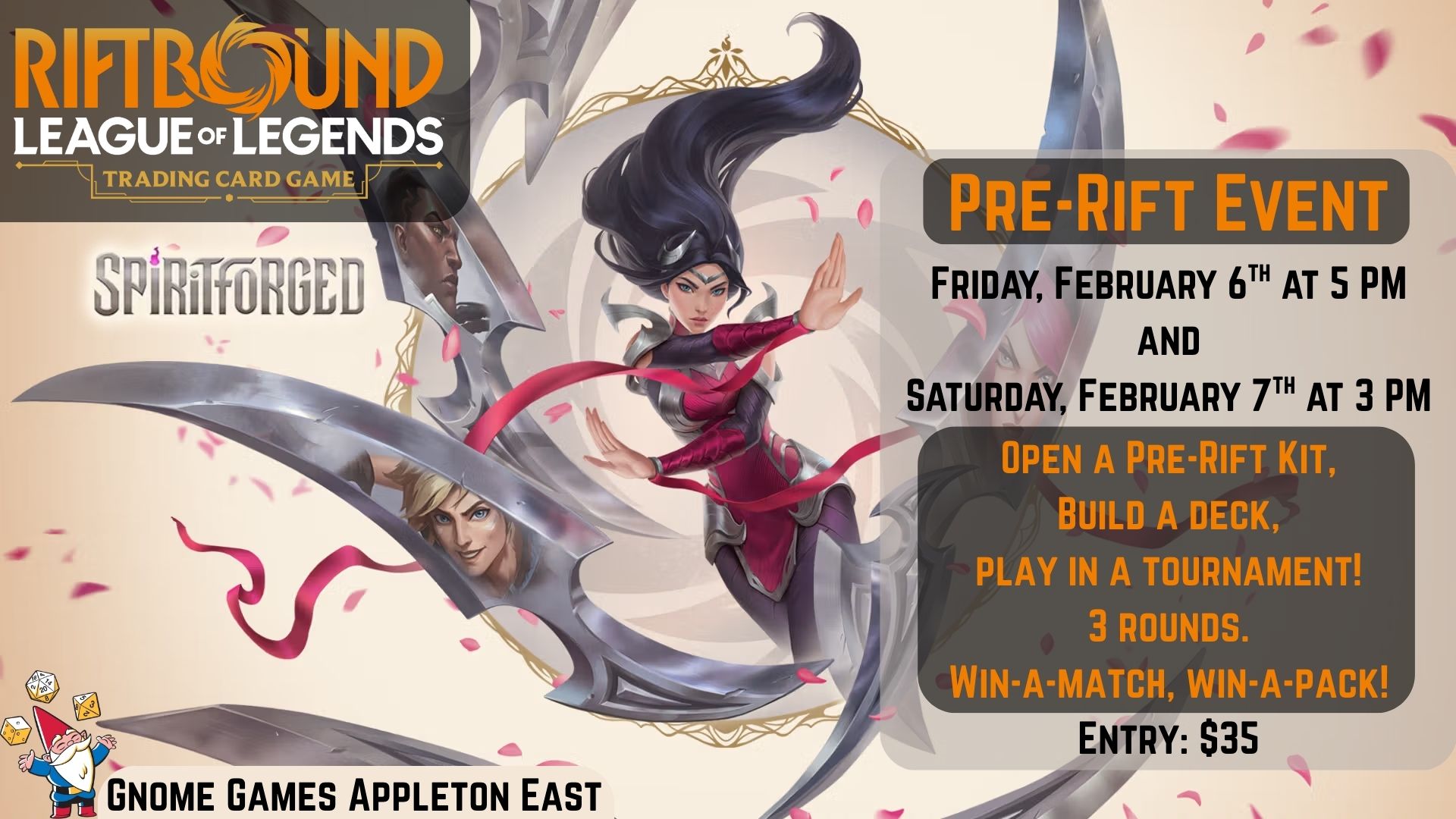 On Friday, February 6th at 5 PM and Saturday, February 7th at 3 PM we’re hosting Spiritforged Pre-Rift Events! A Pre-Rift event is an exclusive chance to open packs of the newest set a week before it comes out! Open up a Pre-Rift kit, which contains 5 booster packs, a mini 15-card deck, and a promo card, then build a deck. Afterwards, we’ll launch into a 3 round Swiss style tournament where each round won awards you with a Spiritforged pack! Players will have 50 minutes to deck build, then rounds will be 50 minutes, best of 3.