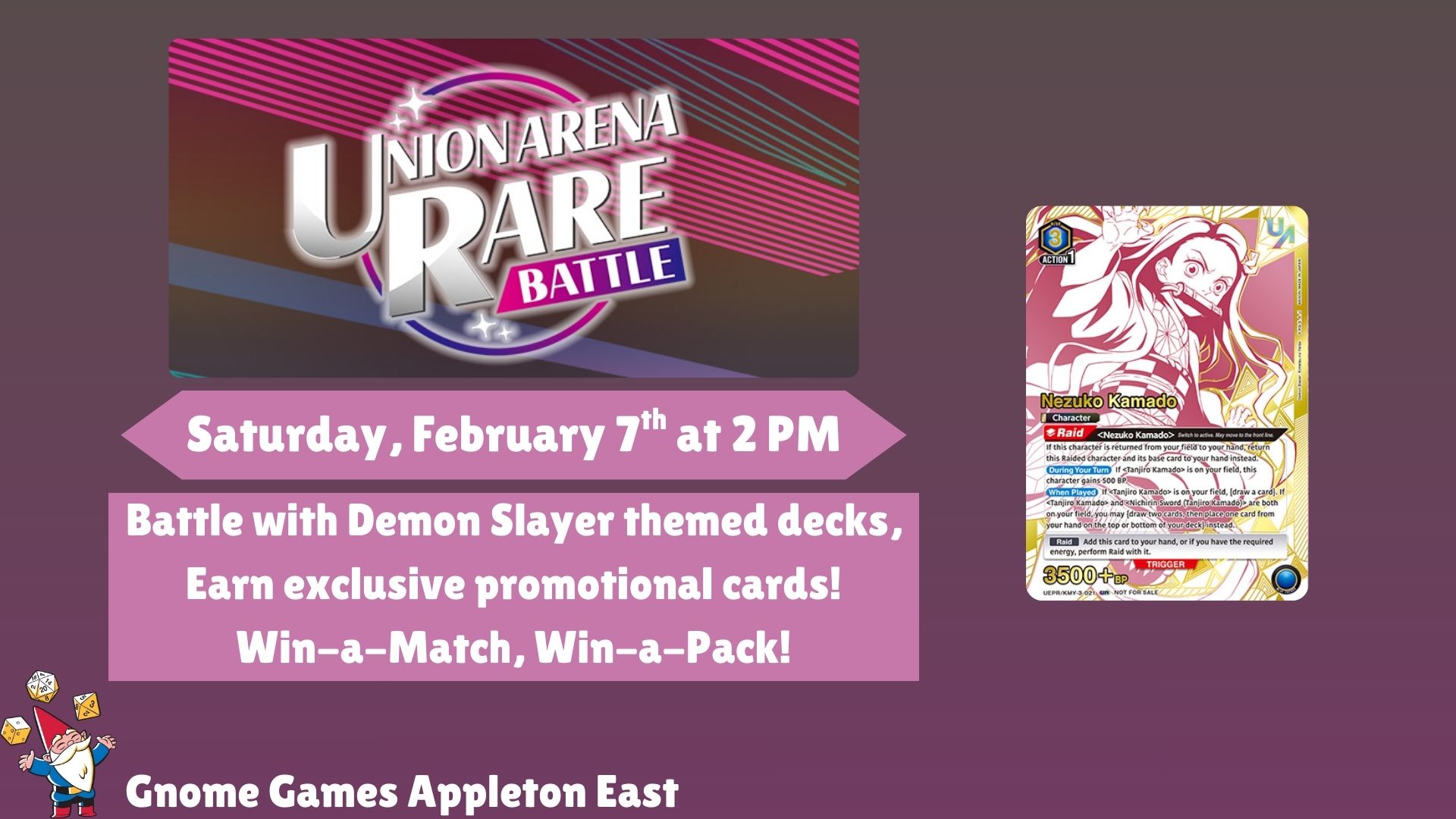 On Saturday, February 7th at 2 PM we’re hosting a Union Arena Rare Battle for Demon Slayer: Kimetsu no Yaiba Vol. 2! Using decks specifically themed around Demon Slayer: Kimetsu no Yaiba, players will battle in 3 rounds of a Swiss style tournament. There are exclusive promos for participation, top 4, and the grand Winner, so bring your best decks. Rounds are 30 minutes, best of 1. Each round won awards players with an additional pack of Demon Slayer Vol. 2!