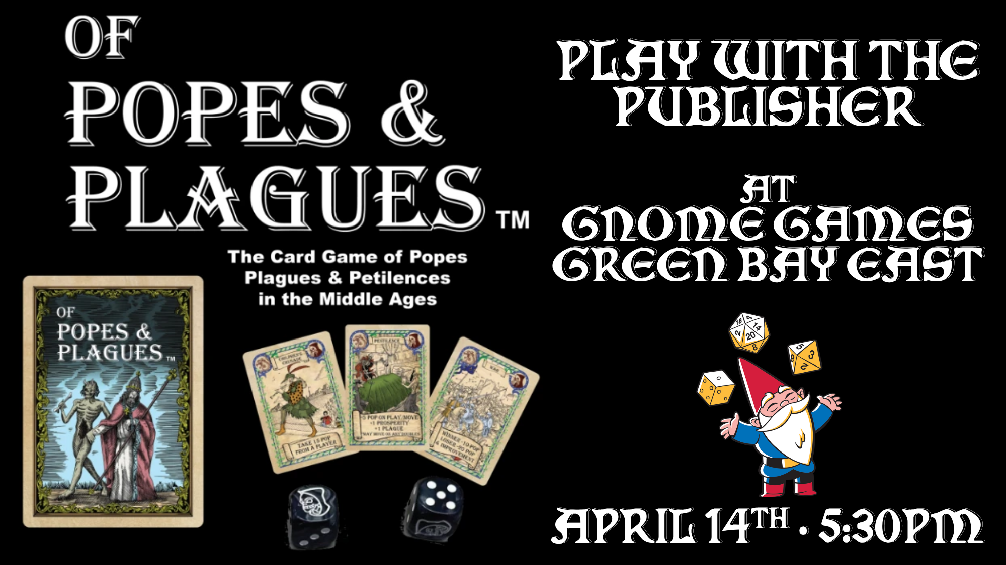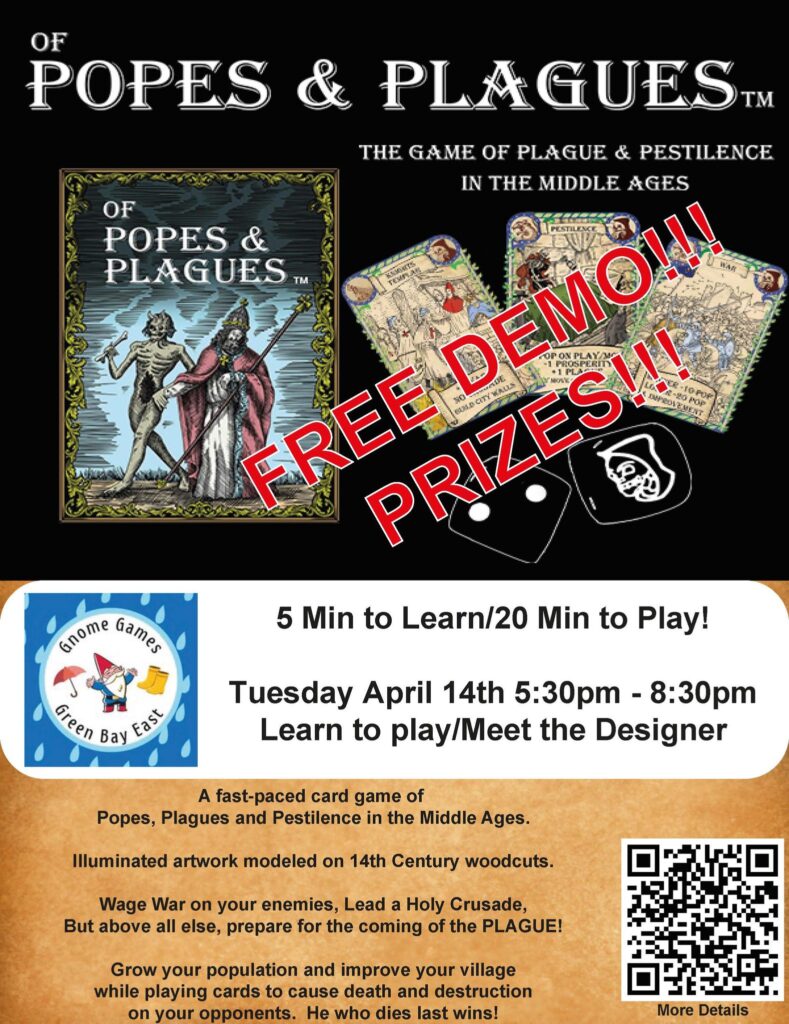 Meet the designer of Of Popes and Plagues and learn how to play this fast-paced card game at Gnome Games Green Bay East!