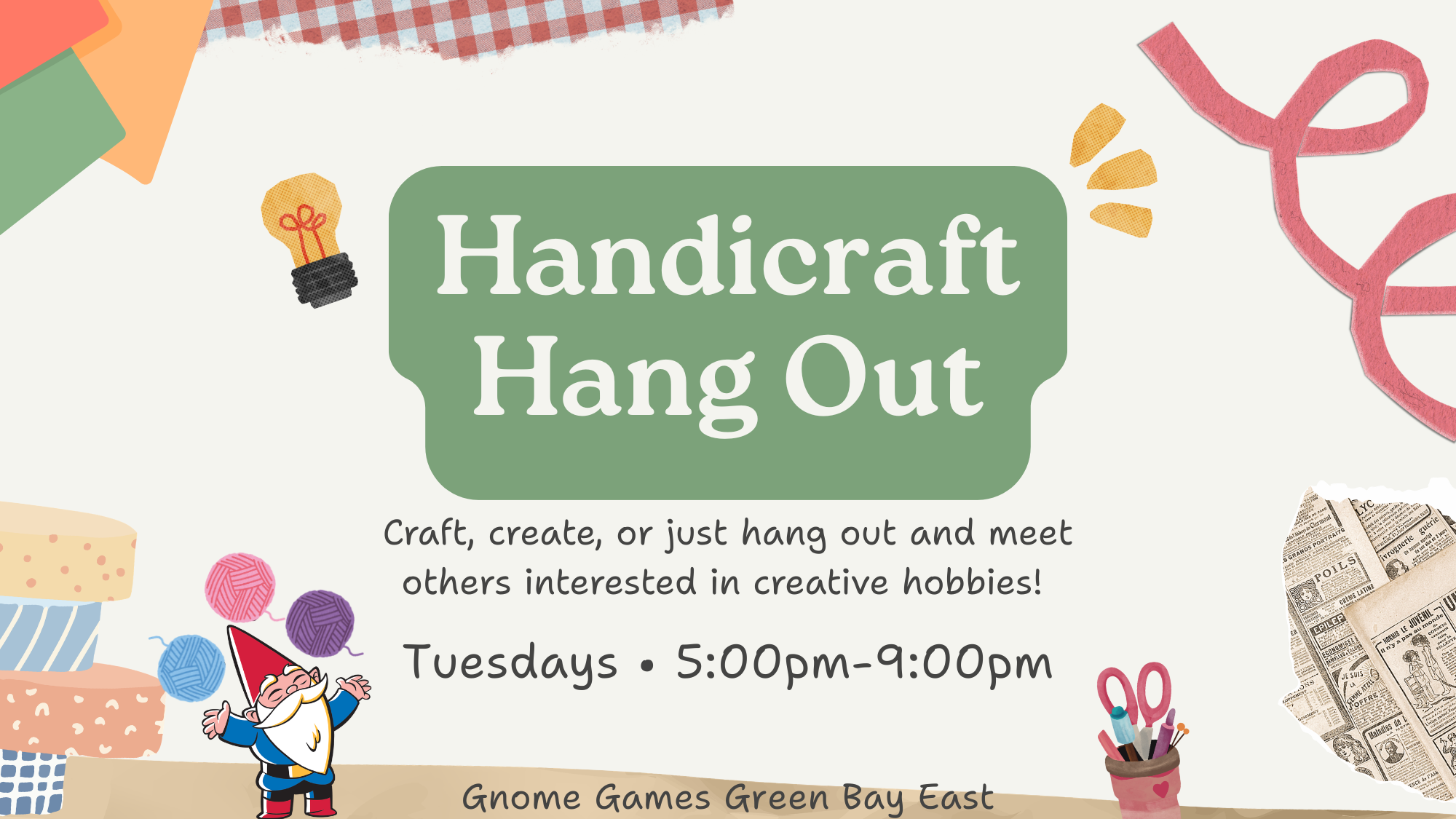 Join us at Gnome Games Green Bay East for a weekly Handicraft Hangout!