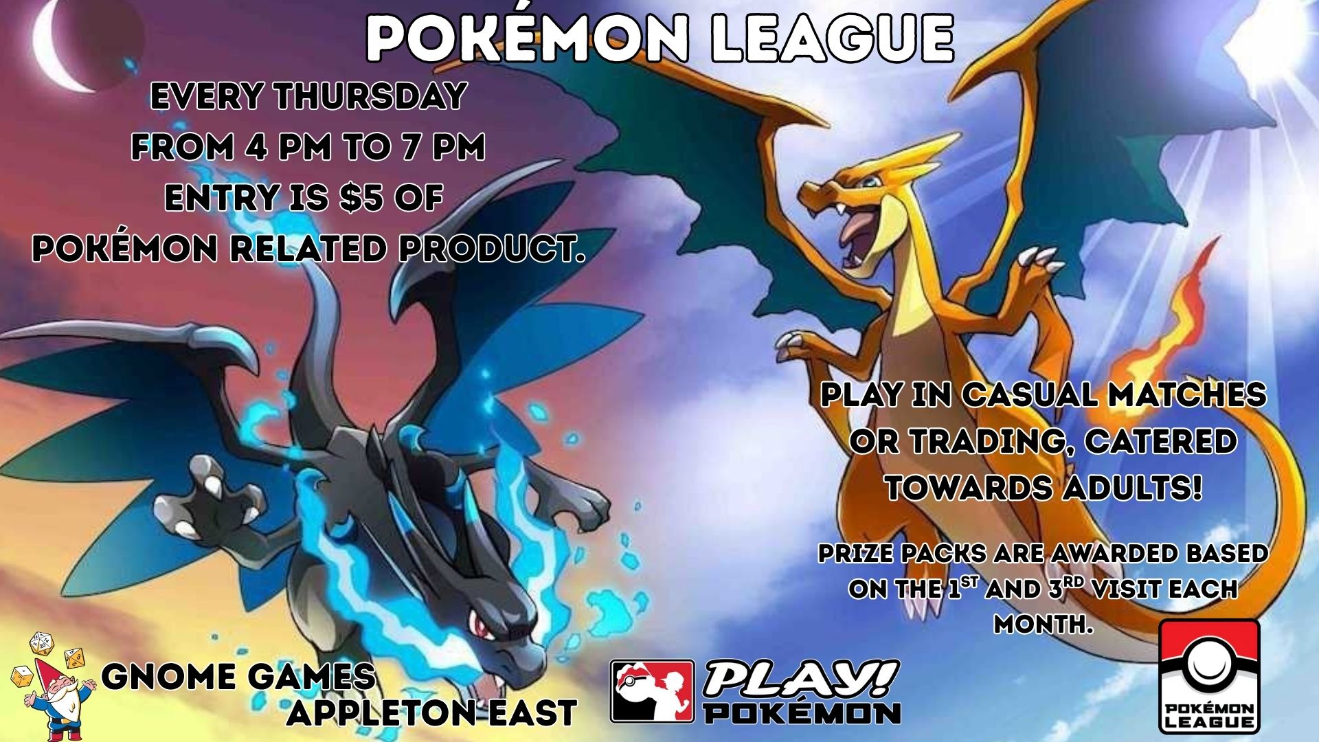 Every Thursday from 4 PM to 7 PM, we’re hosting Pokémon TCG League! TCG stands for trading card game. League nights are all about battling, trading, and more with a focus on our adult crowd! Don’t know how to play? We will have resources readily available to anyone looking to learn, including play mats that emphasize zones and what to do on your turn. Pokémon isn’t just a kids game!