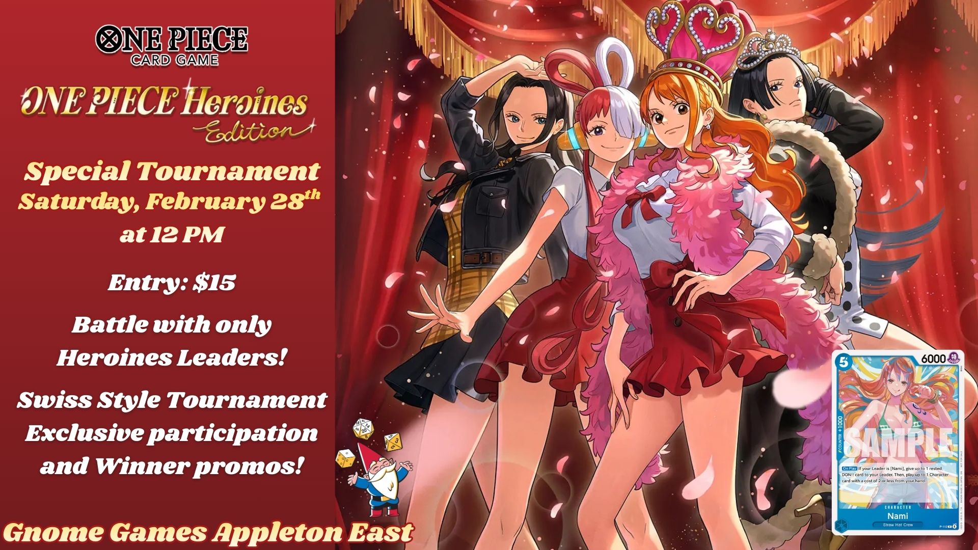 On Saturday, February 28th at 12 PM we’re hosting a Heroines Battle Event! Celebrate the release of the newest One Piece Card Game set, Heroines Edition [EB03], by playing in a special themed tournament! Players are restricted to only the Leader cards of the Heroines of One Piece. Rounds are based on attendance, with the highest being 5 Rounds, No Top Cut. This is a Swiss style Tournament. Each round is 30 minutes, best of one, where each round won awards players with a pack of Extra Booster -One Piece Heroines Edition- [EB03]! Participants all receive a Heroines Battle Pack, while the Winner of the event receives a Heroines Winner Pack!