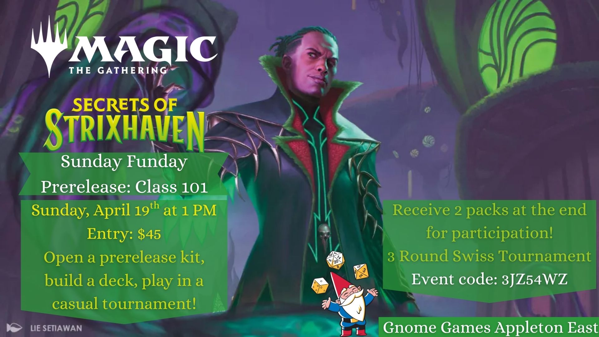Join us at Gnome Games Appleton East for our Magic the Gathering: Secrets of Strixhaven Sunday Funday Prerelease!