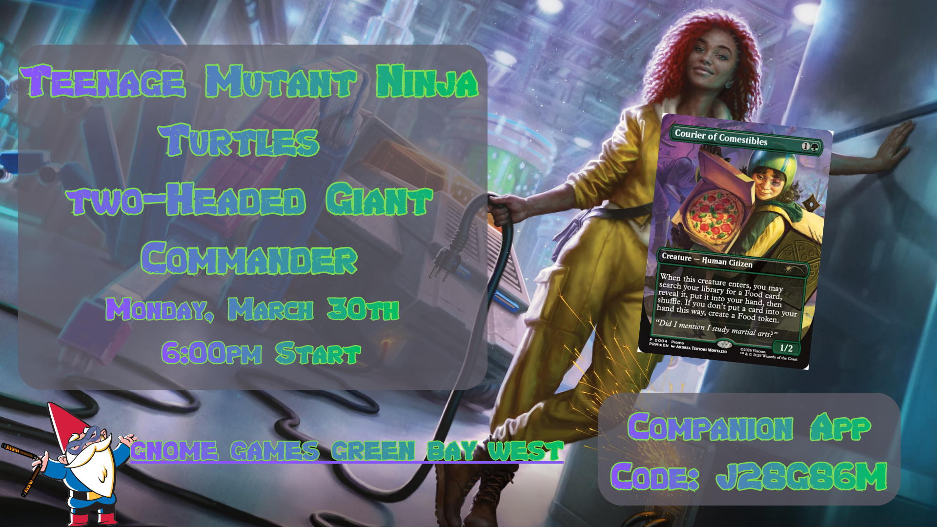 Join the Gnomes at Gnome Games Green Bay West for some Teenage Mutant Ninja Turtles fun with a Two-Headed Giant Commander Event celebrating this totally Turtle Power filled set on Monday, March 30th!