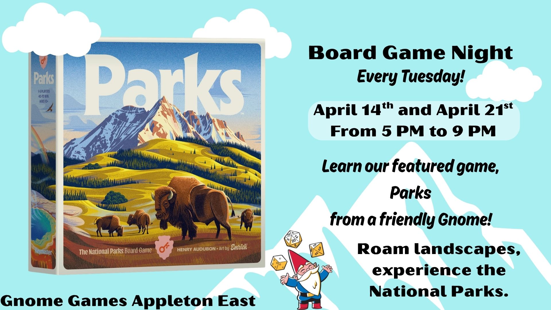 Every Tuesday from 5 PM to 9 PM, join us for a guided learning experience for a board game! This week’s board game: Parks! A demo copy is set up ahead of time so players can pick up and learn without the stress of set-up and take-down. A friendly Gnome is available to teach the game!