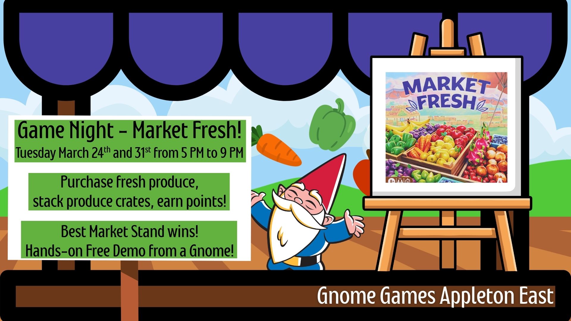 FeaturedGnome Games Appleton East W3169 Van Roy Road, Appleton, WI, United StatesJoin us at Gnome Games Appleton East for our latest Board Game night focus, Market Fresh! On Tuesday, March 24th and March 31st, come learn a brand new game! The focus for these weeks is: Market Fresh! Released on January 23rd of this year, Market Fresh pits you against your fellow players to measure your […]